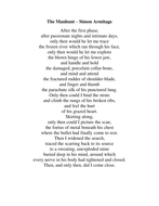The manhunt simon armitage. Laura s poem the manhunt after the first phase after passionate nights and intimate days only then would he let me trace the frozen river which ran through his face only then would he let me explore the blown hinge of his lower jaw and handle and hold. The manhunt by simon armitage. After the first phase after passionate nights and intimate days only then would he let me trace.